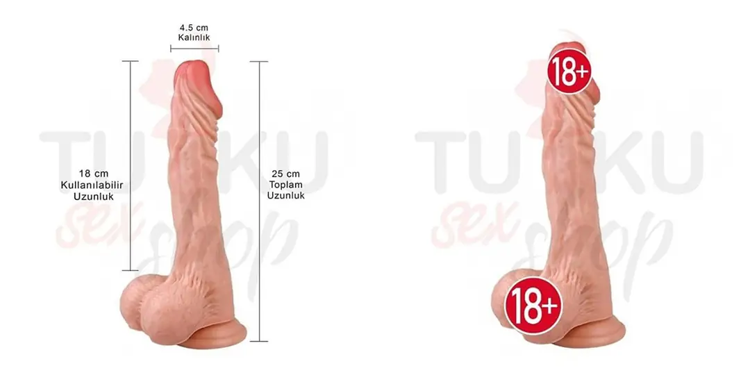 uzunluğundaki bu kalın gerçekçi dildo, 4.5 cm genişliği ve 18 cm kullanılabilir